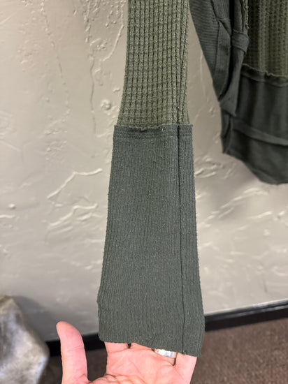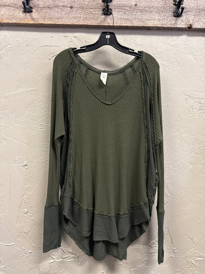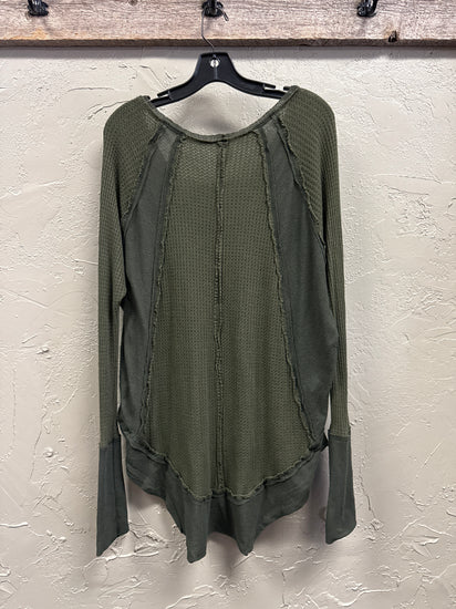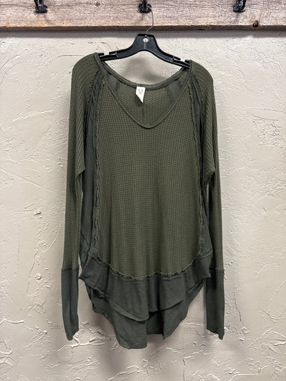 Description : Long-sleeve olive green tunic with a textured waffle pattern across the front, features a wide neckline, side seams with contrasting smooth fabric, and a longer back hem, loose fit with relaxed sleeves tapering at the wrists.