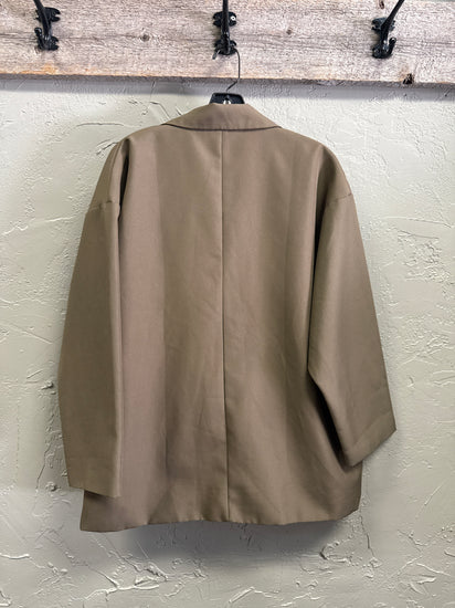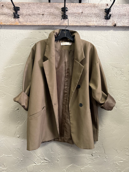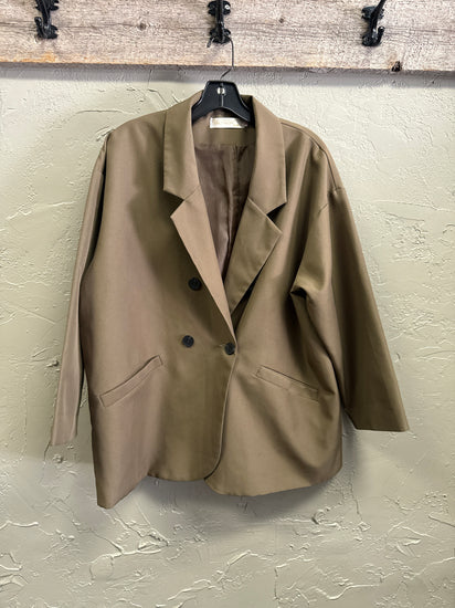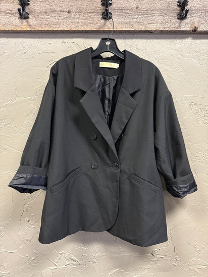 Description : Loose-fitting, double-breasted blazers with notched lapels, two front flap pockets, black buttons, and a smooth inner lining