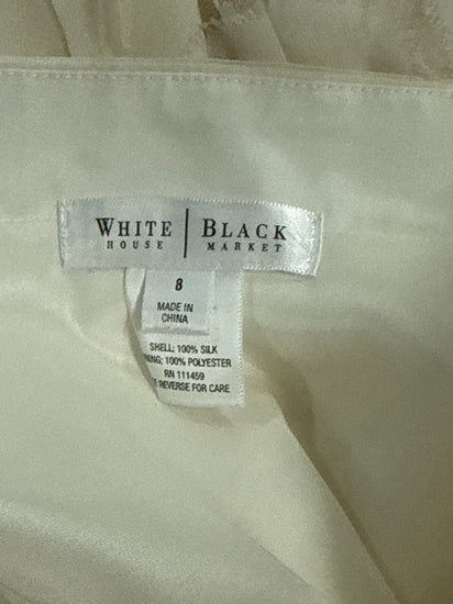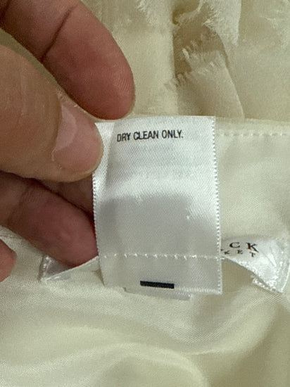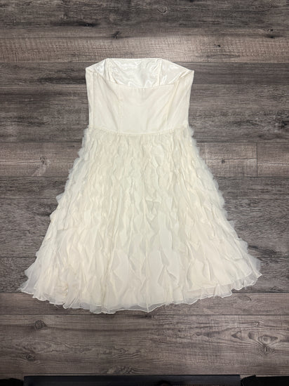 Description : 100% silk strapless dress in an off-white/ivory shade with a fitted bodice and a textured skirt made of layered, petal-like ruffles creating a soft, voluminous silhouette