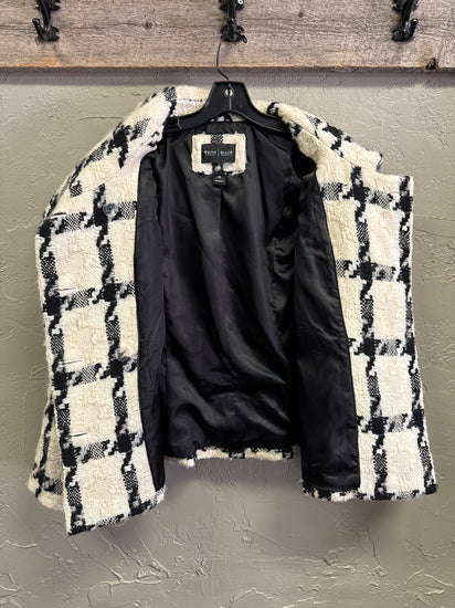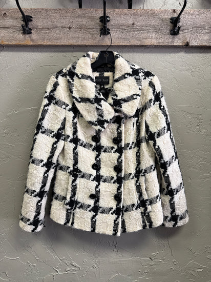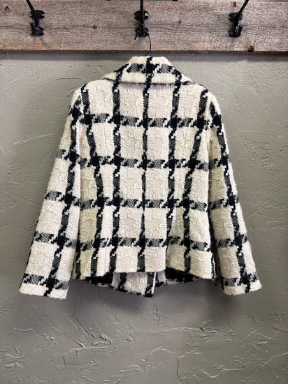 Description : Double-breasted short coat in a cream bouclé fabric with a bold black windowpane check, featuring a wide rounded collar and black front buttons, with long sleeves and welt pockets visible.
