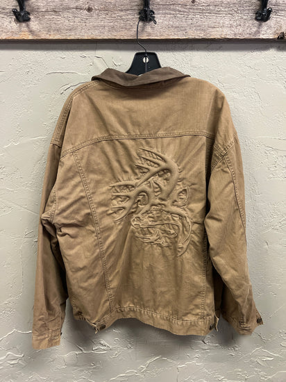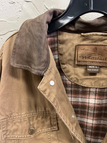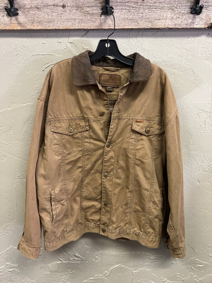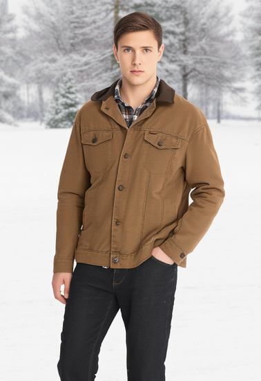 Description : 100% cotton brown denim jacket featuring a leather collar, button-front closure, two chest pockets with flaps. Flannel lined inside and though the sleeves.
