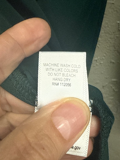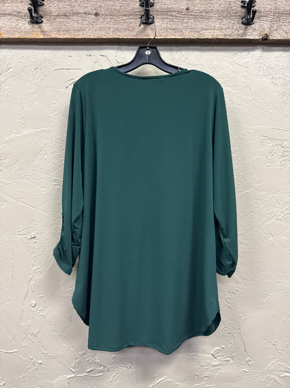 Description : Emerald green long-sleeved tunic with a gold zipper closure at the V-neck and rolled sleeve tabs with buttons.