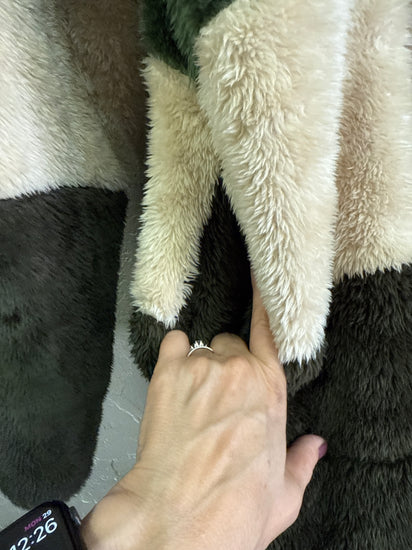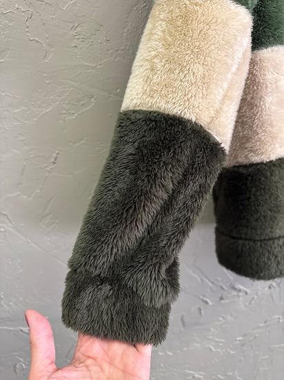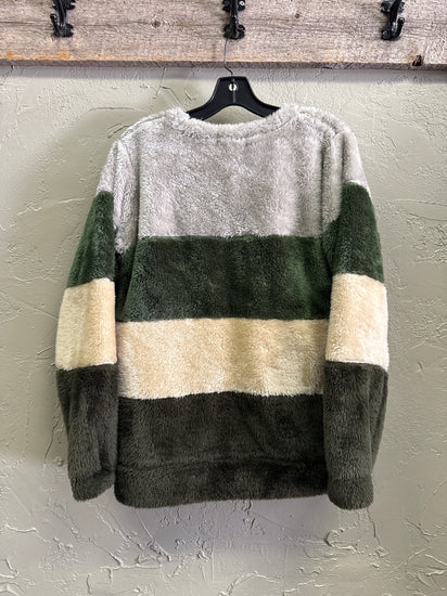 Description : Plush long-sleeve crewneck fleece pullover with horizontal color-block stripes in light gray, muted forest green, soft beige, and deep olive; relaxed fit with a fluffy, textured surface. Features include a round neckline and full-length sleeves with a slightly dropped shoulder seam.