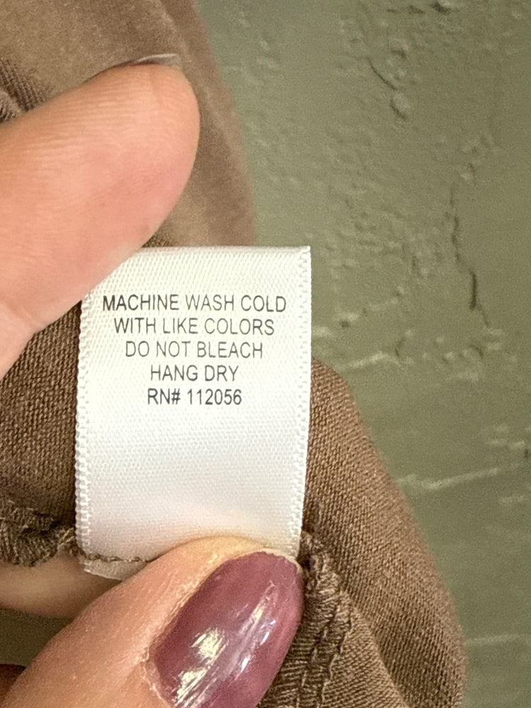 Description : Long-sleeve, crew-neck tunic in a muted taupe with 3/4 sleeves and an asymmetrical hem, featuring a ruched drawstring detail on the right side. The fabric is soft and drapey, creating gentle gathers at the hip.